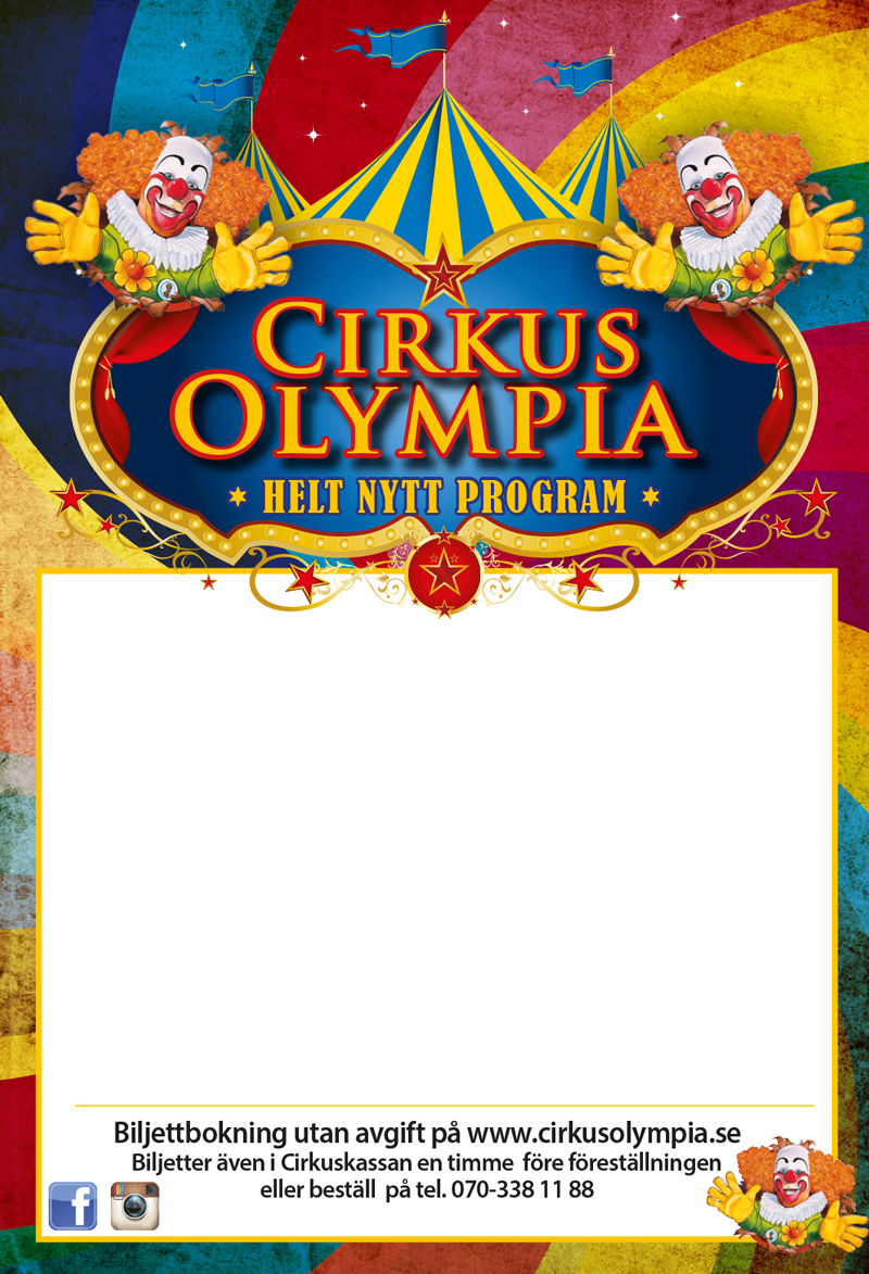 För färdigt annonsoriginal pdf-format, klicka på länken nedan med höger musknapp och välj "Spara länk som" (Chrome), "Spara mål som" (Internet Explorer) eller "Spara länk som" (Firefox) i menyn som visas. Välj "source" som format. Bilden sparas i önskad mapp. Text, typ plats, datum, tid mm kan sedan läggas in i det vita fältet. Länk till annonsoriginal PDF nr 1 - Cirkus Olympias egna föreställningar